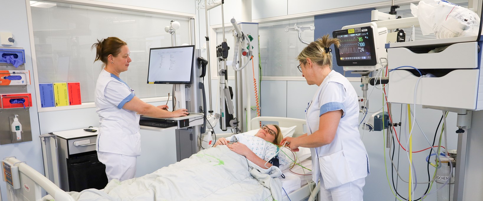 De MiCS (Medium Care, Coronary Care Unit (CCU of hartbewaking) en Stroke-Unit) bevindt zich qua zorgintensiteit tussen Intensieve zorgen en een gewone verpleegafdeling. We ontvangen hier patiënten met verschillende ziektebeelden van één of meerdere vitale organen (zoals hart, longen, hersenen, nieren, inwendige organen, bloedvaten) en patiënten die een zeer uitgebreide heelkundige ingreep ondergaan hebben. Hier bevindt zich ook een eenheid voor acute beroertezorg.