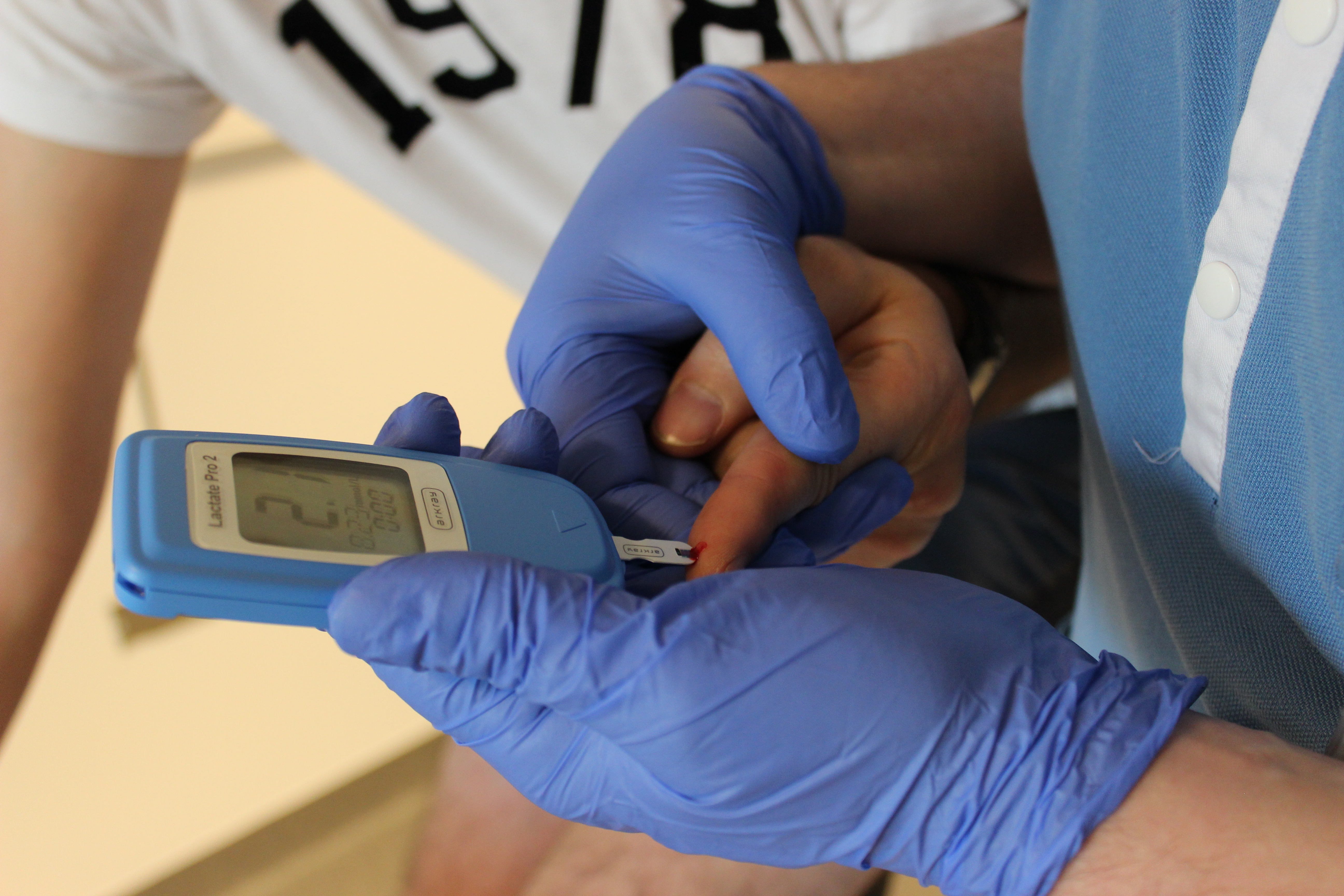 Tijdens het medische luik bevragen we je eventuele cardiale klachten. Als dat nodig is verwijzen we, in samenspraak met de arts Fysische geneeskunde, door naar de cardioloog. Het conditionele luik bestaat uit het meten van de hartslag bij oplopende inspanningsniveaus. Aan het einde van elke inspanningstrap doen we een lactaatmeting. Hiervoor krijg je een klein prikje in de vinger of de oorlel. Met een druppeltje bloed bepalen we de lactaatwaarde.